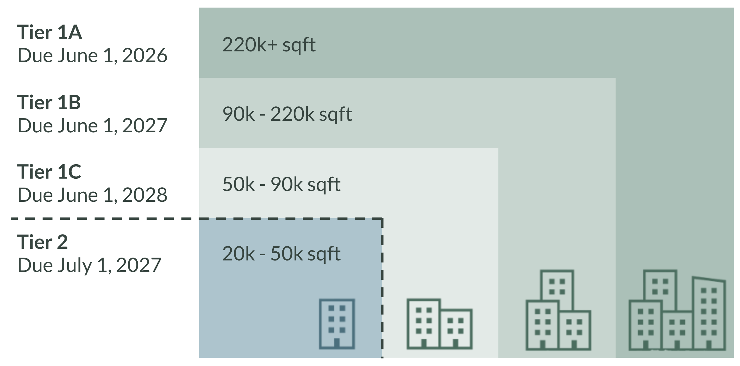 Tier 2 covers buildings between 20,000 and 50,000 square feet, as well as all multifamily residential buildings over 20,000 square feet. Tier 2 buildings must complete benchmarking, develop an EMP, and implement an O&M program—though they are not yet required to meet a specific EUIt target. The compliance deadline for all Tier 2 buildings is July 1, 2027.