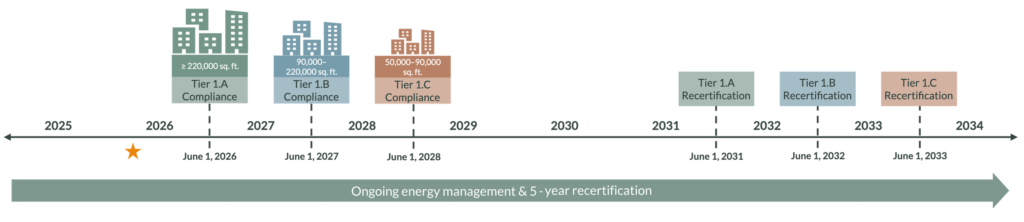Tier 1 covers commercial buildings over 50,000 square feet. These buildings must meet EUIt targets, implement an Energy Management Plan (EMP), and maintain an Operations & Maintenance (O&M) program. Compliance deadlines are staggered by building size: